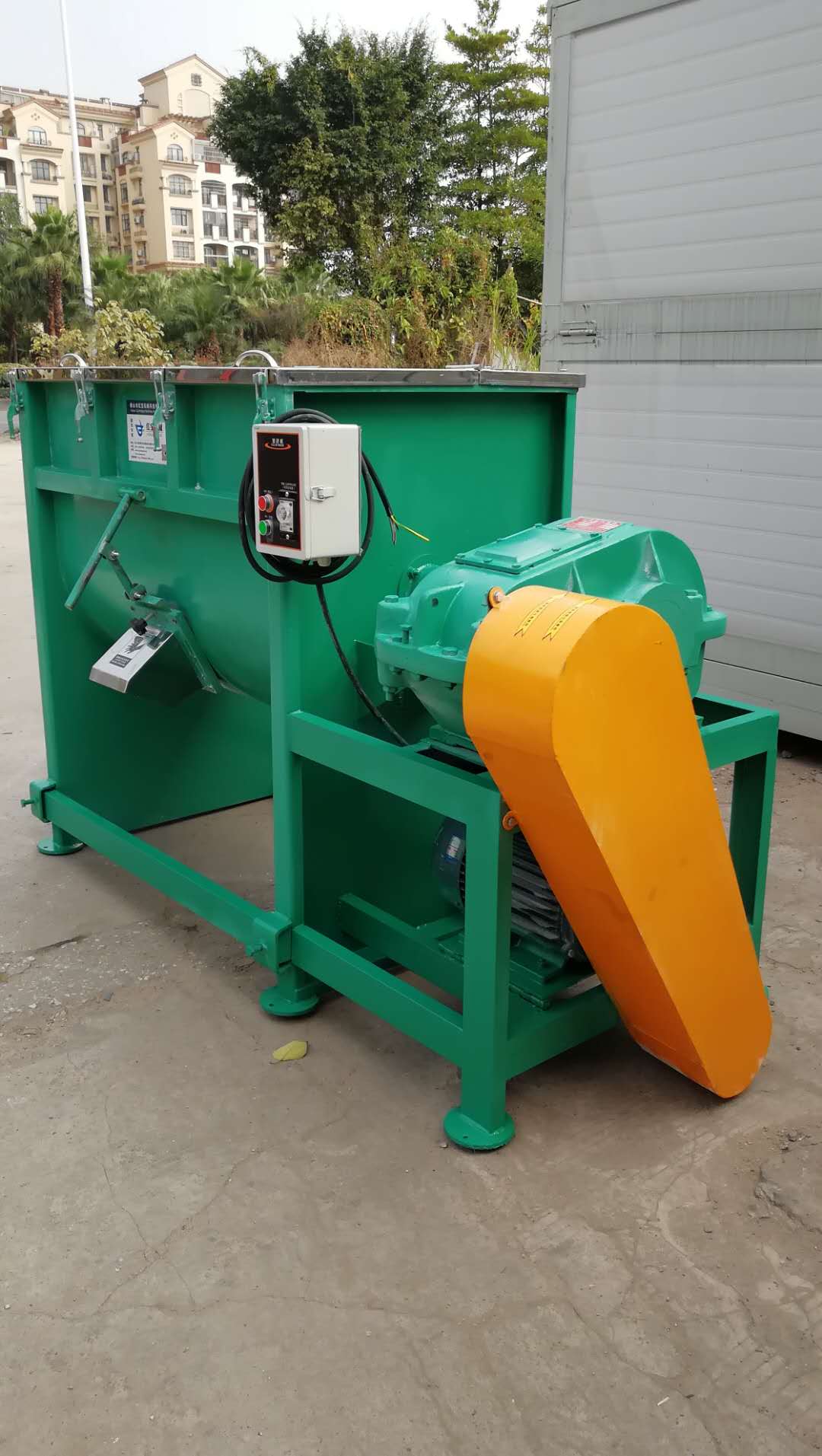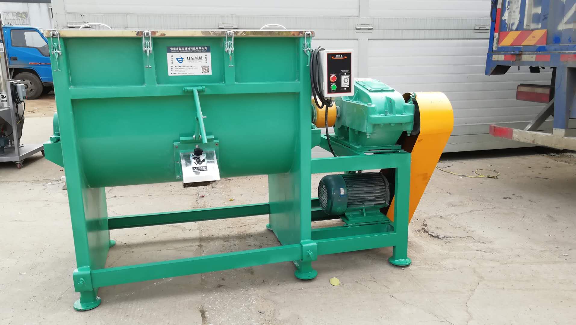 险位置打开主机立即断电。按钮控制、安全可靠、使用寿命长。该机特点:耗电少,饲料卧式搅拌机,效率高,且自动化程序优良,大大减轻劳动强度。