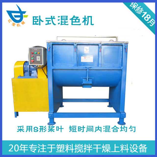 卧式螺带塑料混料机的搅拌器结构设计成内外三层螺旋叶片,混合机工作时,内、外螺旋带动筒体内物料翻动,内螺旋带动靠近轴心处物料做轴心旋转,转向由内至两侧推动,物料被推向筒壁四周;外螺旋带动顶部物料以伞状飞抛散落,回至底部,同时做轴心旋转,轴向由两侧至内推动,物料被推向内部聚集,使螺带搅拌器在筒体内最大范围翻动物料,物料在筒体内对流循环,剪切渗混,混合不留盲区,完成物料在短时间内快速均匀混合。